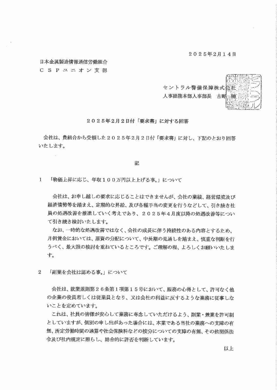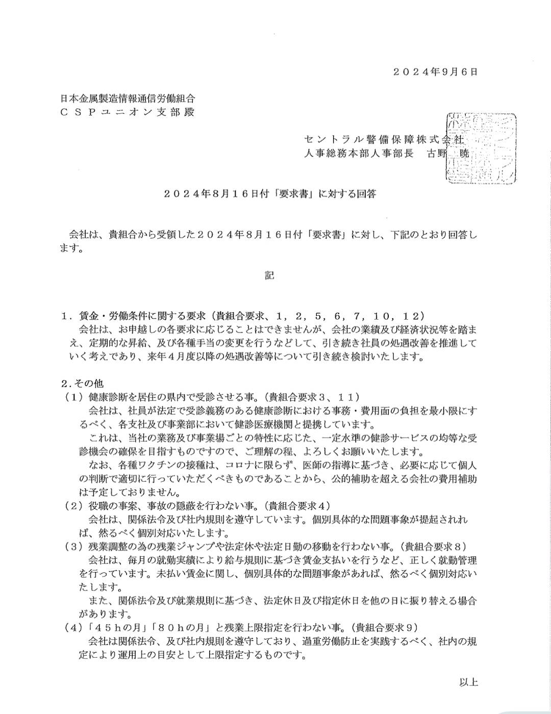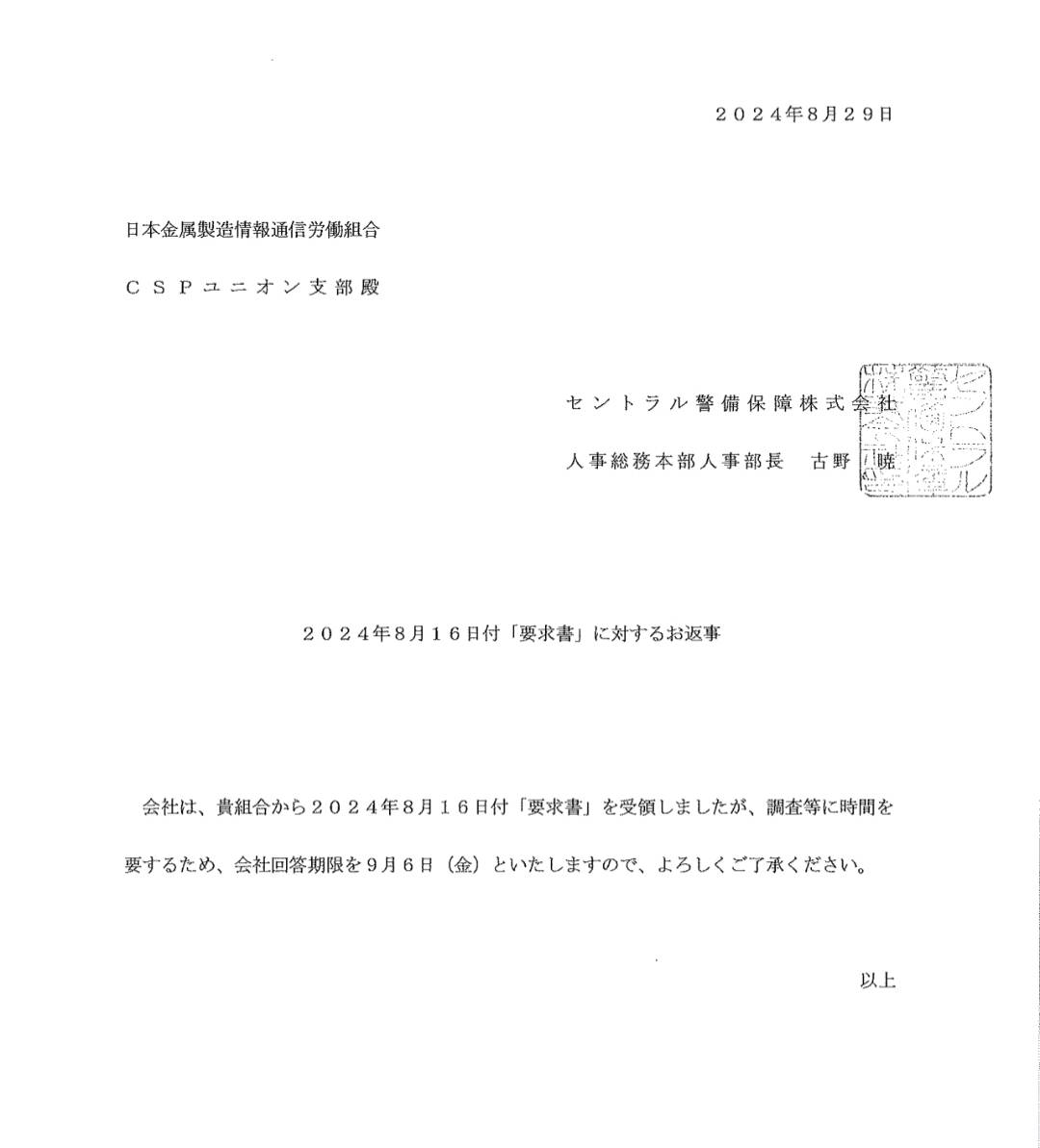 8月16日付でCSP社長に提出した労働組合の要求書に対する人事部長からの回答が届きました。社長宛に出した文書に対し、社長名の回答が来ないことに疑問を抱いているため、こちらの内容をホームページで公開させていただきます。