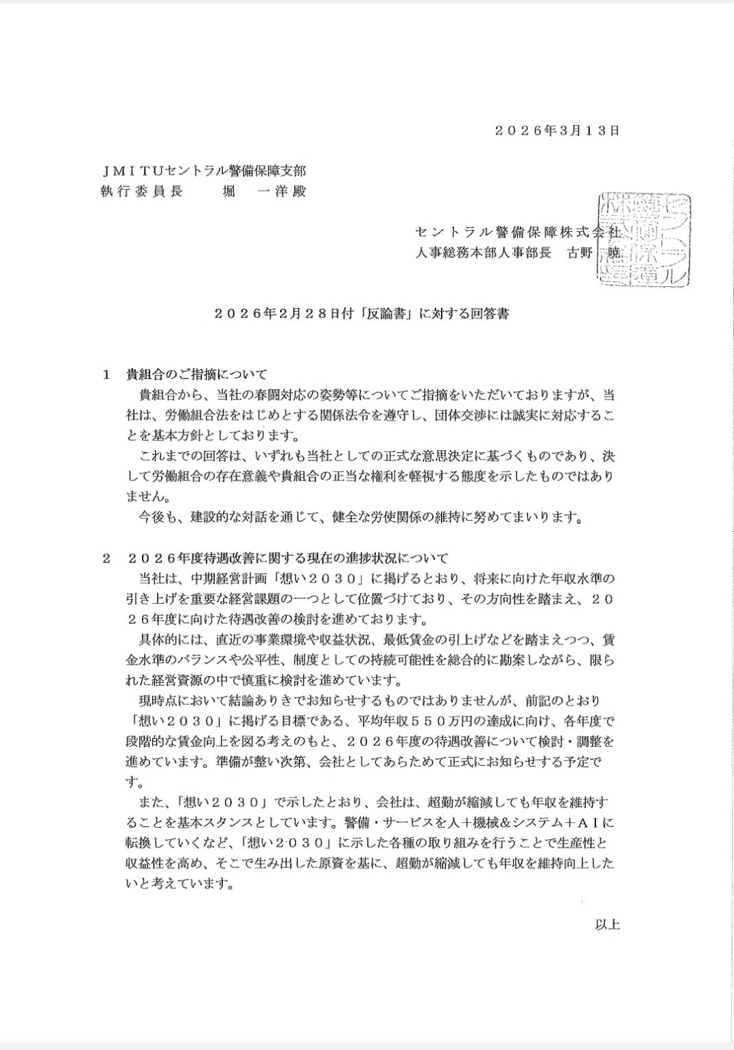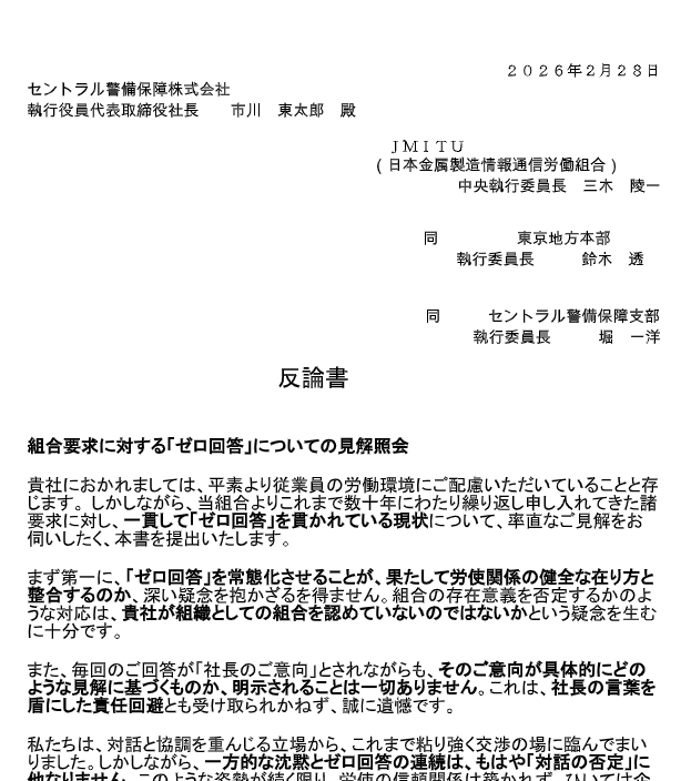 「当社は労働組合との誠実な協議を重視しており、貴組合から申し入れを受けた場合には今後とも誠実に対応する所存です」とあります。